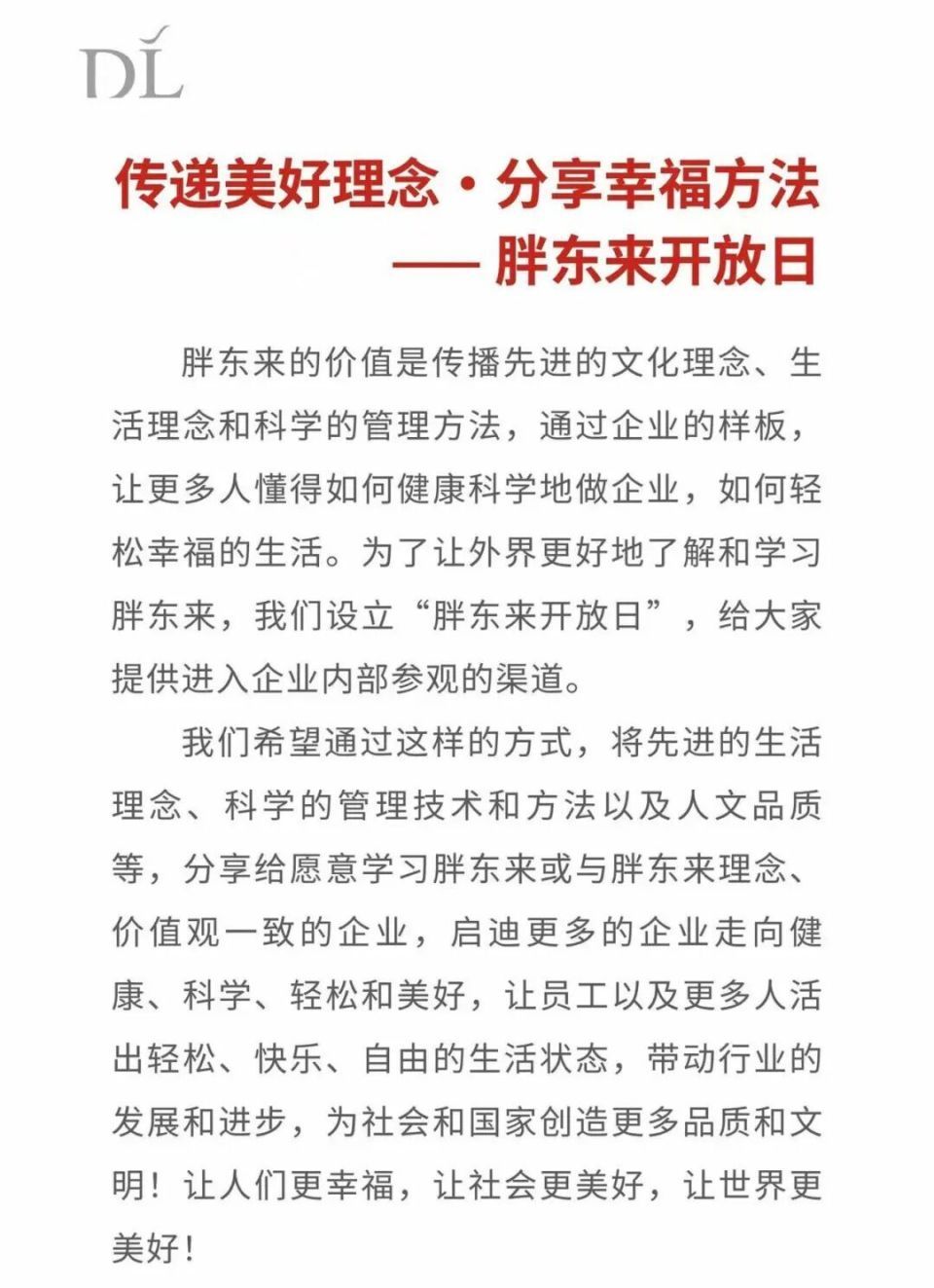 3月18日,胖东来在社交平台公布“开放日”实施细则,胖东来表示为了让外界更好地了解和学习胖东来,设立“开放日”给大家提供进入企业内部参观的渠道。开放时间为每月10日、20日,如遇周二,顺延至次日。收费标准为20000元/人,可以参访范围胖东来产业园、天使城、时代广场。开放对象为企业级学习参访,参访人数为每批次≤15人,同一企业最多预约3人,每年每个企业每人安排参访一次。