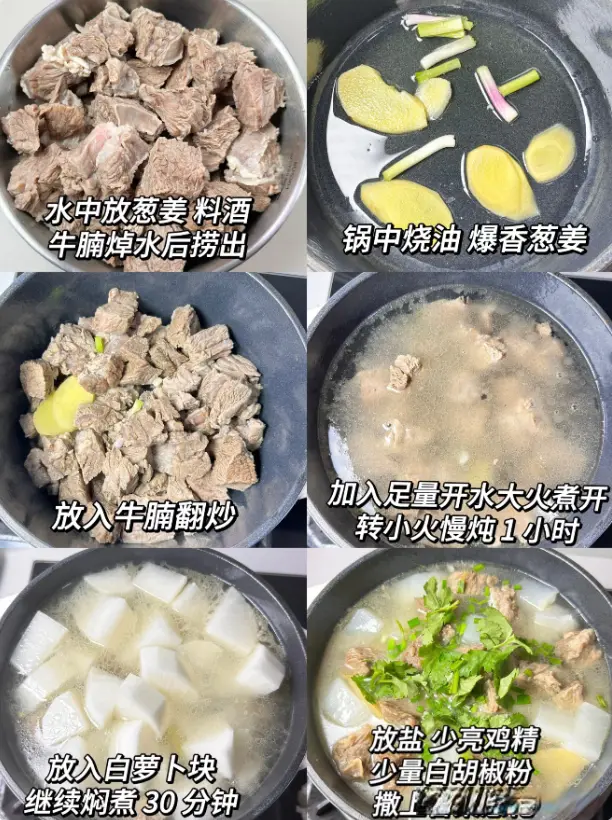 材料:适量牛腩,姜葱蒜,一根白萝卜,料酒,胡椒粉,香菜,葱花,盐。