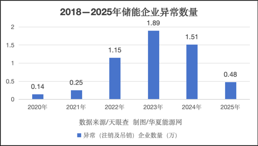 天眼查显示,截至目前,已经处于异常(包括注销及吊销)的储能企业共6.3万家。其中,2025年为4800家,2024年为1.5万家,2023年为1.9万家,2022年为1.15万家,2021年为2500家。