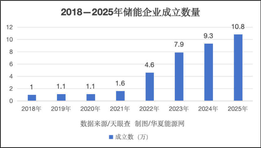 天眼查显示,目前,国内已成立的储能企业数量在43.6万家以上,其中仅2025年一年便有10.8万家新成立的企业,2024年是9.3万家,2023年是7.9万家,2022年是4.6万家,更早的2021年,是1.6万家,而2019年之前,每年成立的储能数量只有几千家。